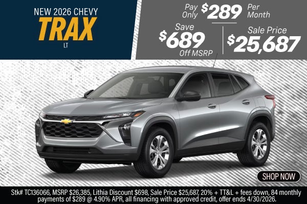 Stk #TC136066, MSRP $26,385, Lithia Discount $698, Sale Price $25,687, 20% + TT&L + fees down, 84 monthly payments of $289 @ 4.90% APR, all financing with approved credit, offer ends 4/30/2026